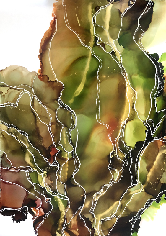 This artwork was part of my solo show: E-Motion: E-motion is an exhibition that explores both physical and emotional states surrounding loss and facing the unknown. Using the unpredictable medium of alcohol inks, E-motion takes us on a journey through the multi-faceted sensations associated with emotional change. The works physically reflect the healing process and the transient nature of our emotions by allowing them to flow through the mind and body rather than being pushed away and internally suppressed. Through vivid and atmospheric expressions, the works in E-motion not only provide us with reflections of the parts of our consciousness that we may not be unable to articulate verbally but also serve as a reminder of the need to recognize the pitfalls of our social conditioning when it comes to dealing with our emotions.